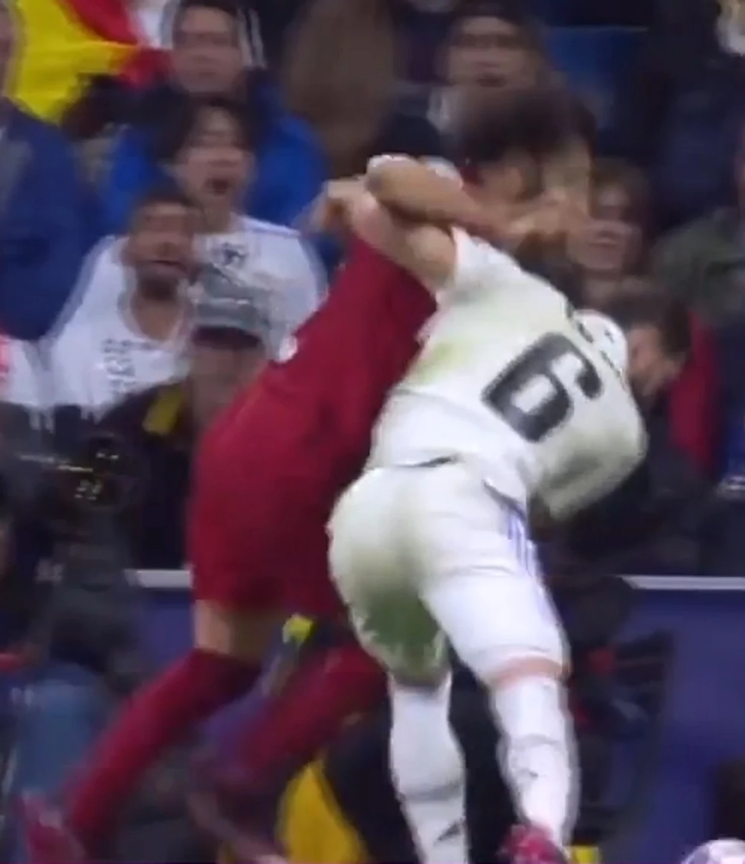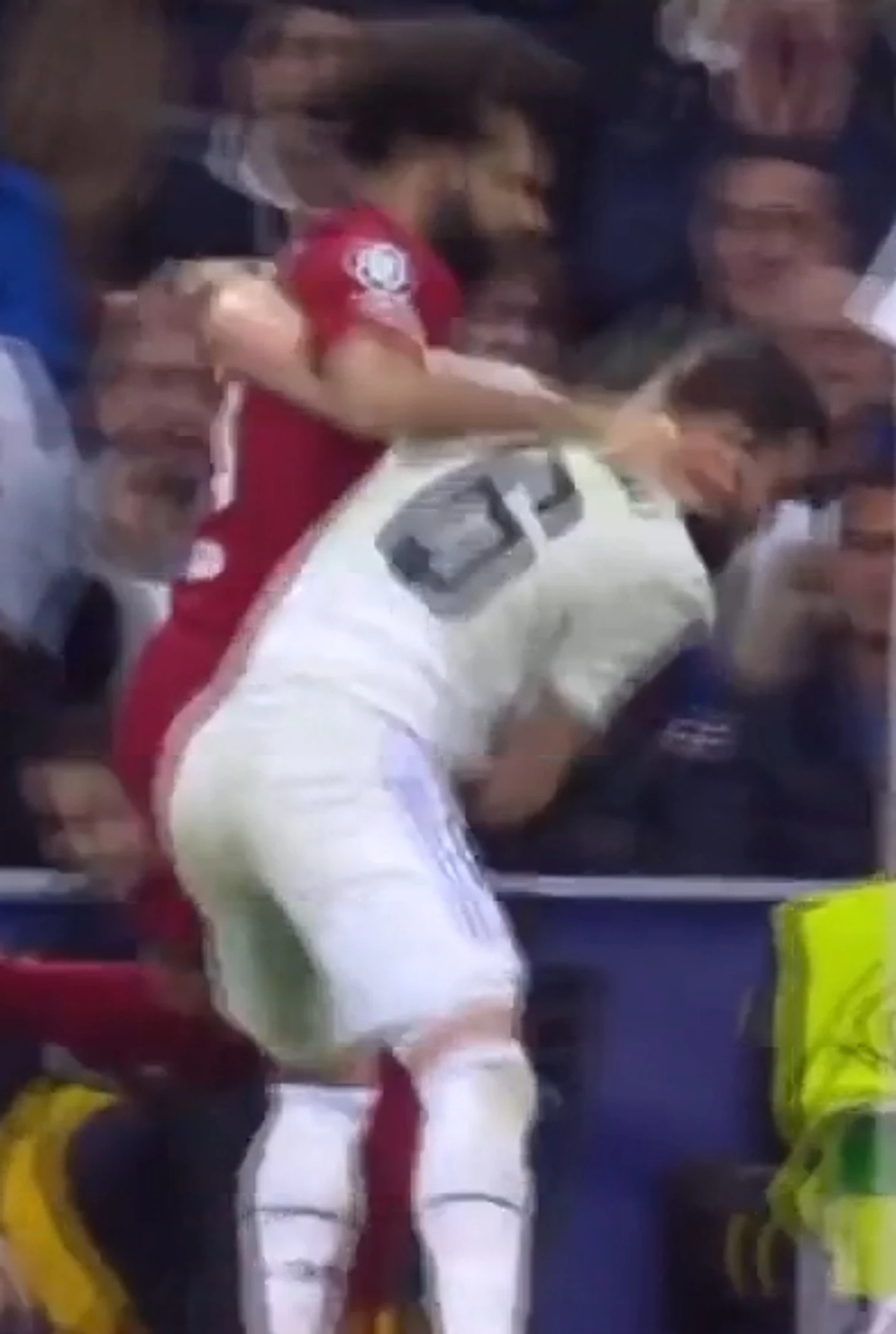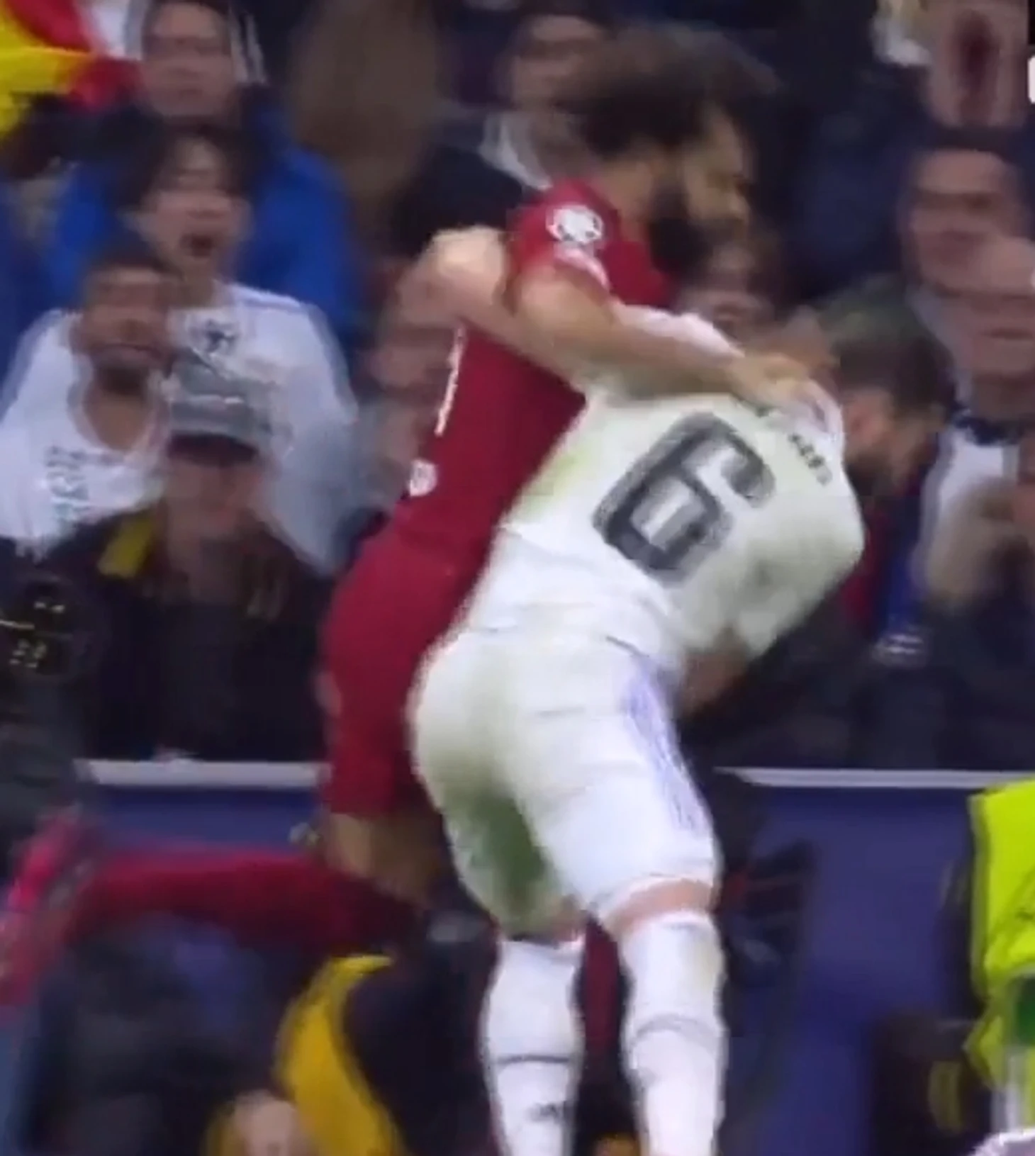Посмотрите на раскадровку. Повтор показали на 80:49 во время матча. Тут Салах, проигрывая силовую борьбу Начо, от бессилия просто бьёт по голове соперника, а потом просто делает вид, что это все случайно. Лучше смотреть видео, но сюда я добавить не могу его.