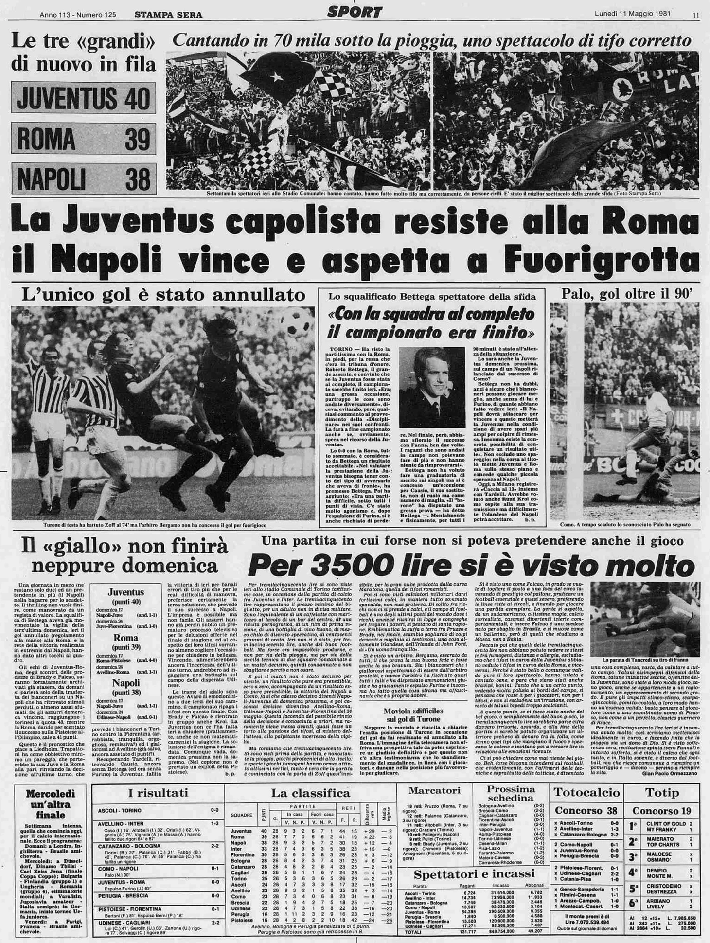 10 мая 1981 года на туринской арене Комунале должна была решиться судьба очередного титула итальянского чемпионата. Борьба на протяжении всего сезона свелась к гонке между двумя клубами - Ювентуса Джованни Трапаттони и Ромы Нильса Лидхольма. До конца оставалось всего три тура, включая прямой матч между Ромой и Юве, команда из Турина опережала соперника всего на один пункт - за весь турнир Старая Синьора всего дважды проиграла, однако волки здесь ответили всего одним поражением в Кальяри и готовностью выгрызть победу в очном поединке за первое место.