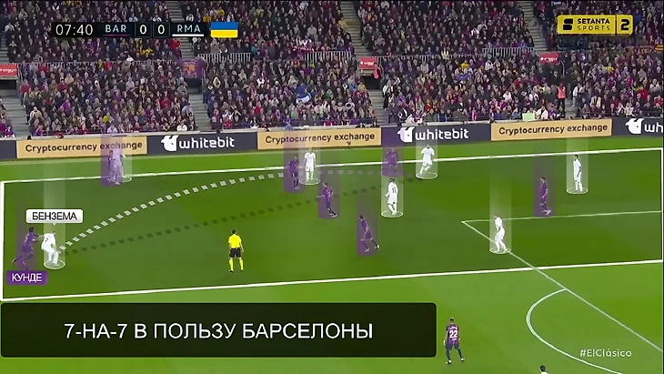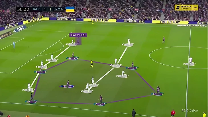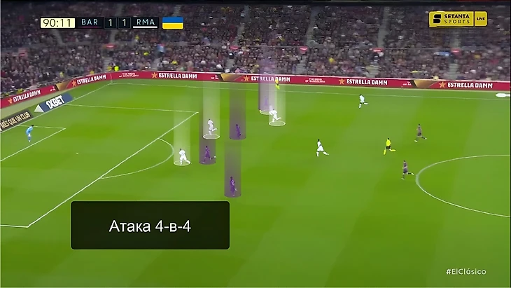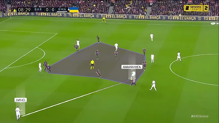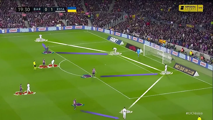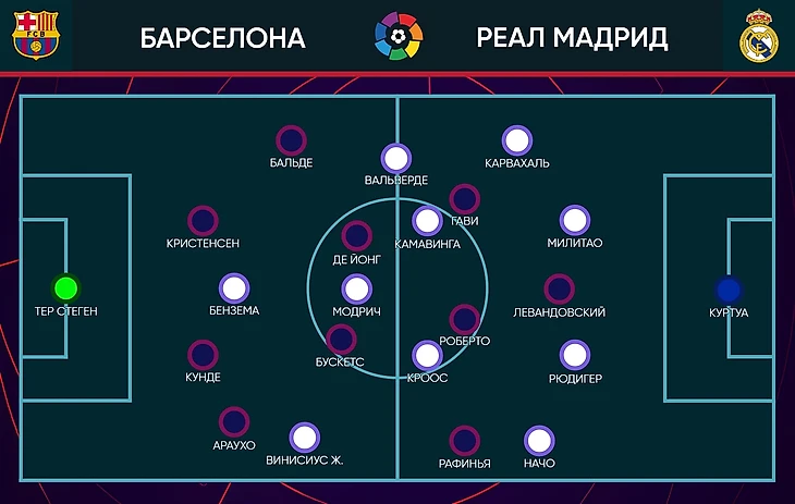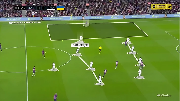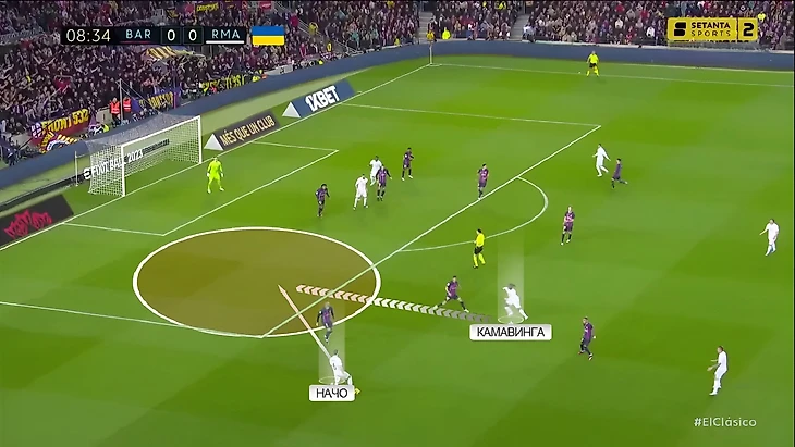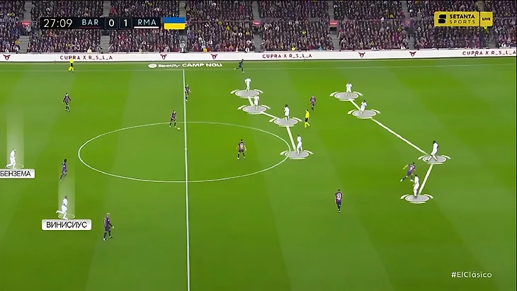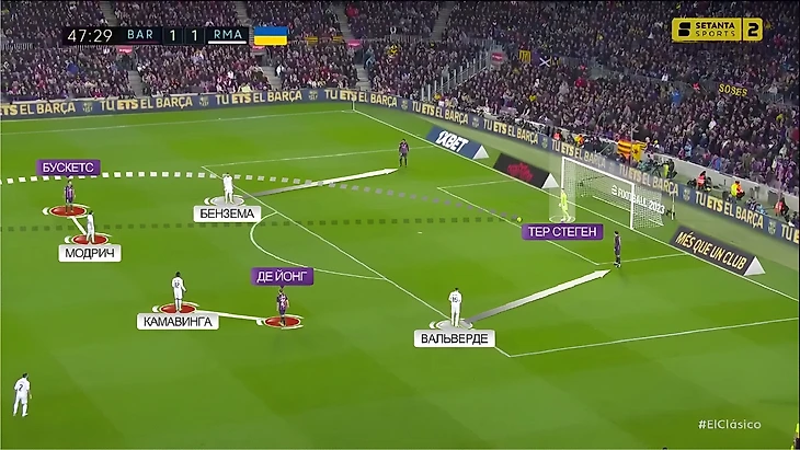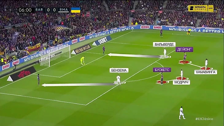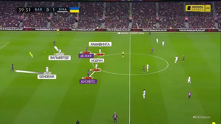 В последний раз, когда команды встречались между собой в полуфинале Кубка Испании, «Реал» радикально больше «Барселоны» владел мячом (65%). Главная причина настолько нетипичного для «каталонцев» рисунка игры стал смелый прессинг «сливочных». В этот раз «Мадрид» снова прессинговал смелее обычного, но Анчелотти немного изменил роль Феде Вальверде. При розыгрышах от ворот хозяев уругваец вместе с Бензема давил на центральных защитников, в то время как Модрич и Камавинга прикрывали Бускетса и де Йонга: