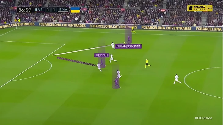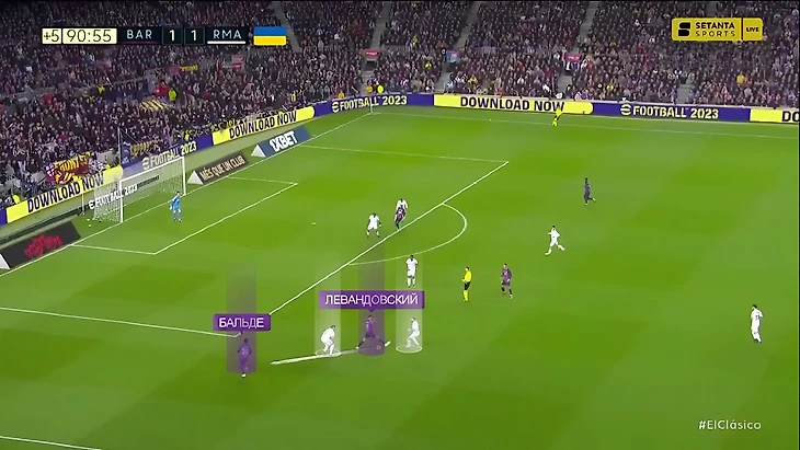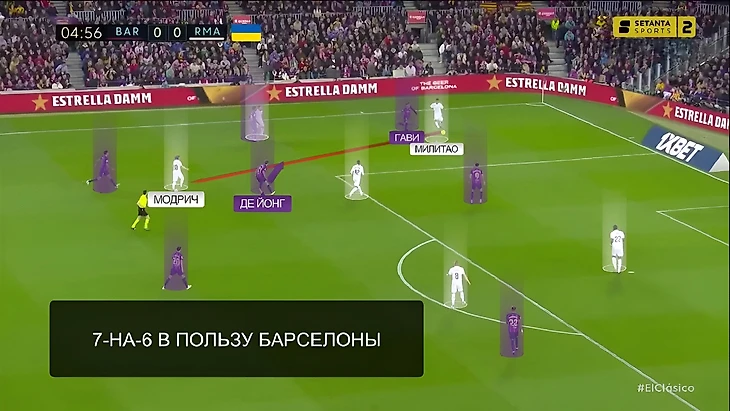 Из похожей ситуации пришёл возможно самый опасный момент в матче. «Барселона» имеет численное преимущество на чужой трети поля и благодаря Гави и де Йонгу возвращает мяч себе: