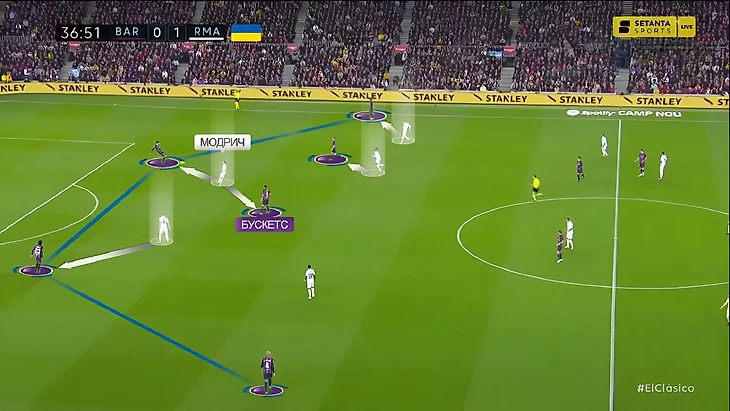 «Мадрид» иногда мог запутывать «Барселону» с помощью опусканий Тони Крооса к защитникам и получать лишнего игрока в начале атак: