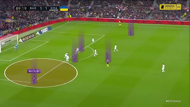 Ещё один вариант – Модрич в двойной роли одновременно давит на защитника и перекрывает линии передач на Бускетса. В таком случае Вальверде может сосредоточиться на Бальде: