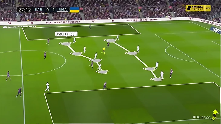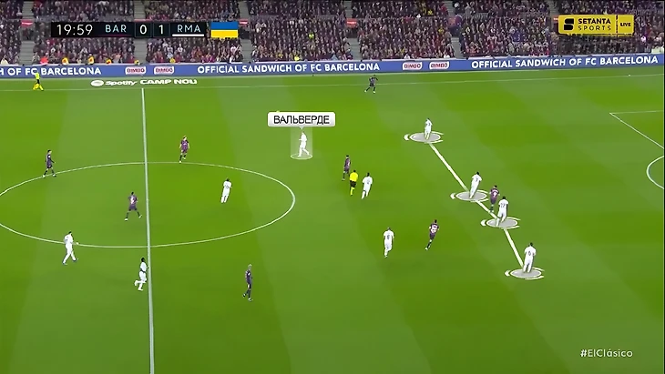 Это можно считать своего рода ответом на дилемму численного преимущества «Барселоны» в центре поля в схеме с четырьмя полузащитниками – Вальверде, который в предыдущих матчах с «каталонцами» садился в линию защиты и образовывал пятёрку, теперь действовал уже выше: