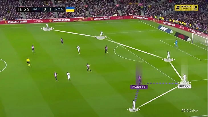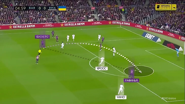 Воспользовавшись тем, что «Реал» не успел перестроиться после потери, Бускетс сразу же забрасывает мяч на Рафинью, который оказался в одиночестве в штрафной за спинами Крооса и Начо:
