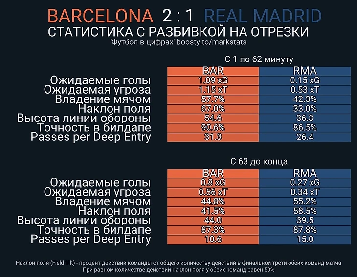 Между ничьей и поражением для «Мадрида» в этом матче не было значительной разницы – отрыв от «Барселоны» либо очень большой, либо гигантский. Именно поэтому Анчелотти был вынужден раскрываться ближе к концовке встречи. Таблица от канала Футбол в цифрах наглядно демонстрирует разницу между первым часом игры и последними 30 минутами: