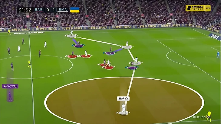 Прессинг в этом матче – сильная черта обеих команд. «Барселона» тоже преуспела в этой стадии и создала «Мадриду» немало проблем. Структура давления была типичной – Левандовский и Гави давили на защитников, а один из флангов оставался более свободным. Чаще всего это был фланг Начо, так как Араухо не поднимался за ним высоко, оставаясь в более осторожной позиции.