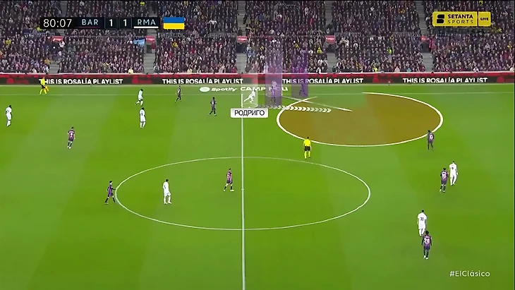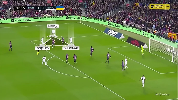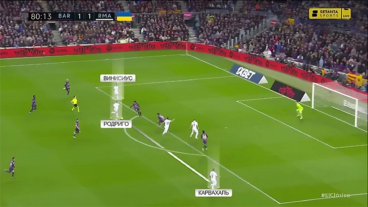 Одна из ключевых замен – выход Родриго, который формально стартовал под нападающим, но на деле часто смещался на левый фланг, чтобы вместе с Винисиусом и Менди вскрывать его: