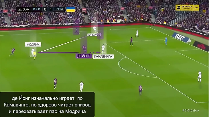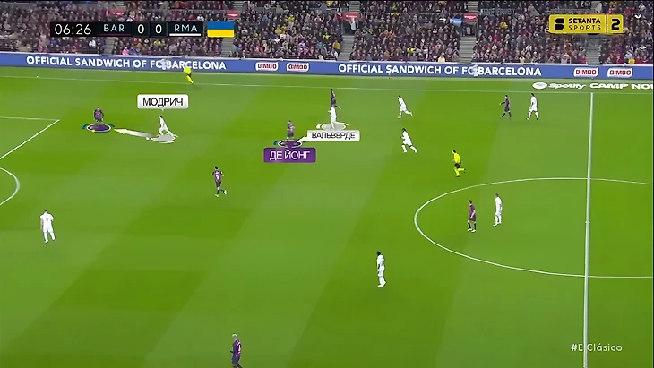 Но когда обороняться нужно было чуть глубже, Модрич и Вальверде могли меняться функциями – хорват давит на защитника (что более естественно для 4-2-3-1), а уругваец закрывает Френки де Йонга: