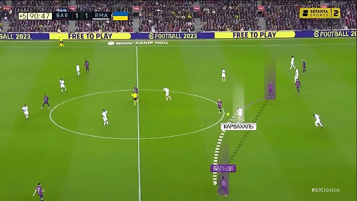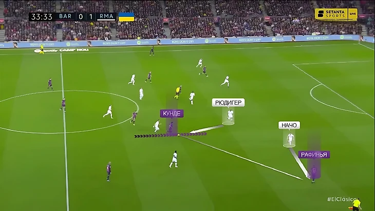 А здесь ситуацию 1-в-1 для Рафиньи против Начо создал рывок Жюля Кунде в атаку, на который среагировал Рюдигер: