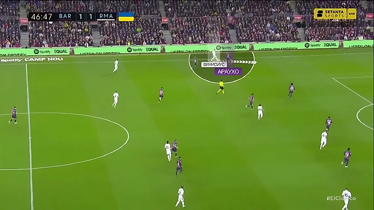 Во-первых, в этом матче Винисиус в принципе индивидуально сыграл лучше, чем в предыдущих Класико и иногда даже обыгрывал Араухо на дриблинге (всё равно редко, но это уже лучше, чем ничего):