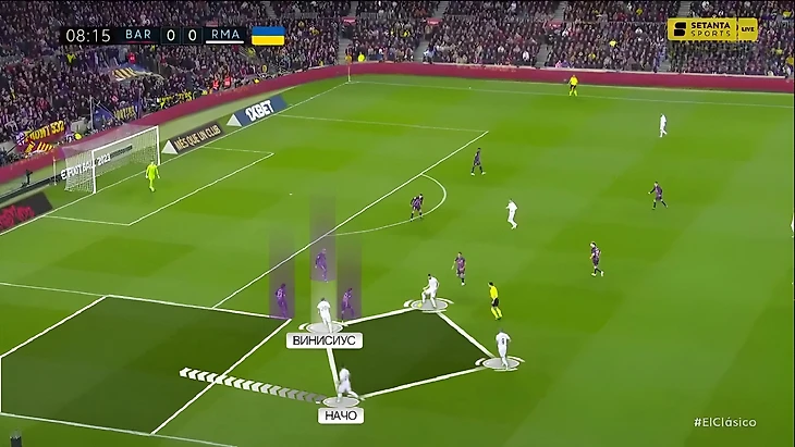 Во-вторых, «Мадрид» с помощью движения игроков создавал на фланге Винисиуса динамику, в которой индивидуальный уровень Араухо был уже не так важен. Один из таких манёвров – смещение Винисиуса в центр поля и заполнение свободной зоны слева (чаще всего это делал Начо):