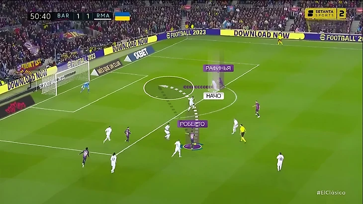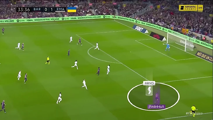 Так как «Барселона» была довольно серьёзно ограничена в атаке, ей приходилось прибегать к более простой игре. В этом матче мы часто могли увидеть моменты, когда «каталонцы» сильно стягивались на левый фланг, чтобы потом резко перевести на более свободный правый, где уже должен был разбираться Рафинья. В этом эпизоде, например, Серджи Роберто в стиле Педри сделал заброс на Рафинью – Начо успел к мячу: