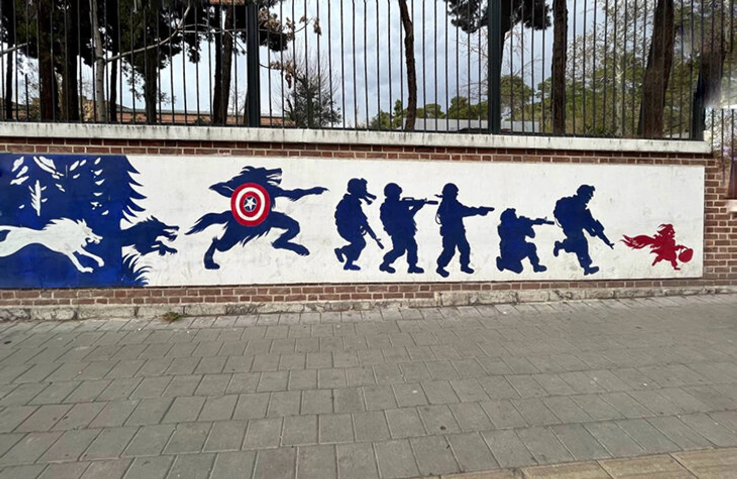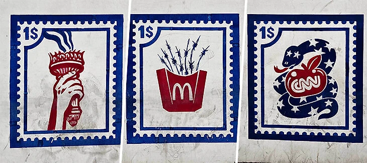 Упаковка из Макдональдса с колючей проволокой вместо картошки-фри. Микки-Маус с пистолетом. Горящий факел в руке статуи Свободы.