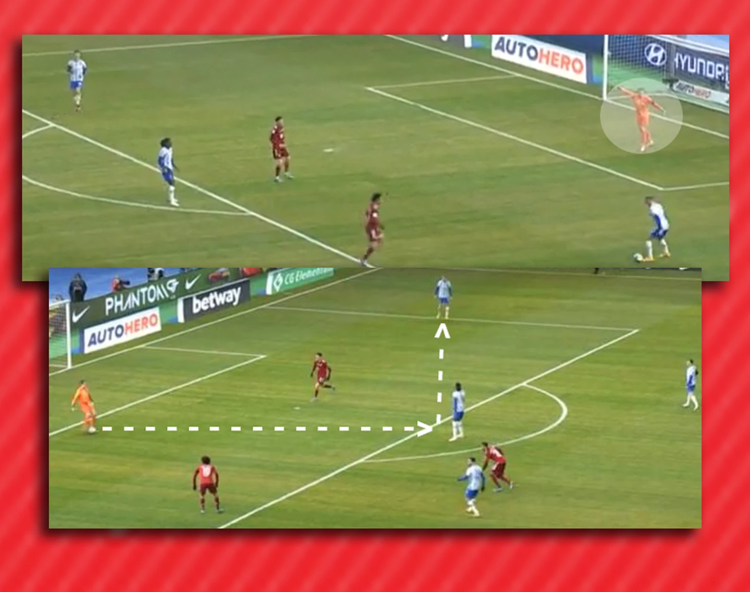 Январь 2022 года. Берлин. Матч между «Гертой» и «Баварией», где ворота берлинского клуба защищает Александр Шволов. Мюнхенцы с первых же минут начинают пользоваться зоной между защитниками и вратарем. «Герта», на руку гостям, заигрывает с искусственным офсайдом и совершает ошибки в тайминге.