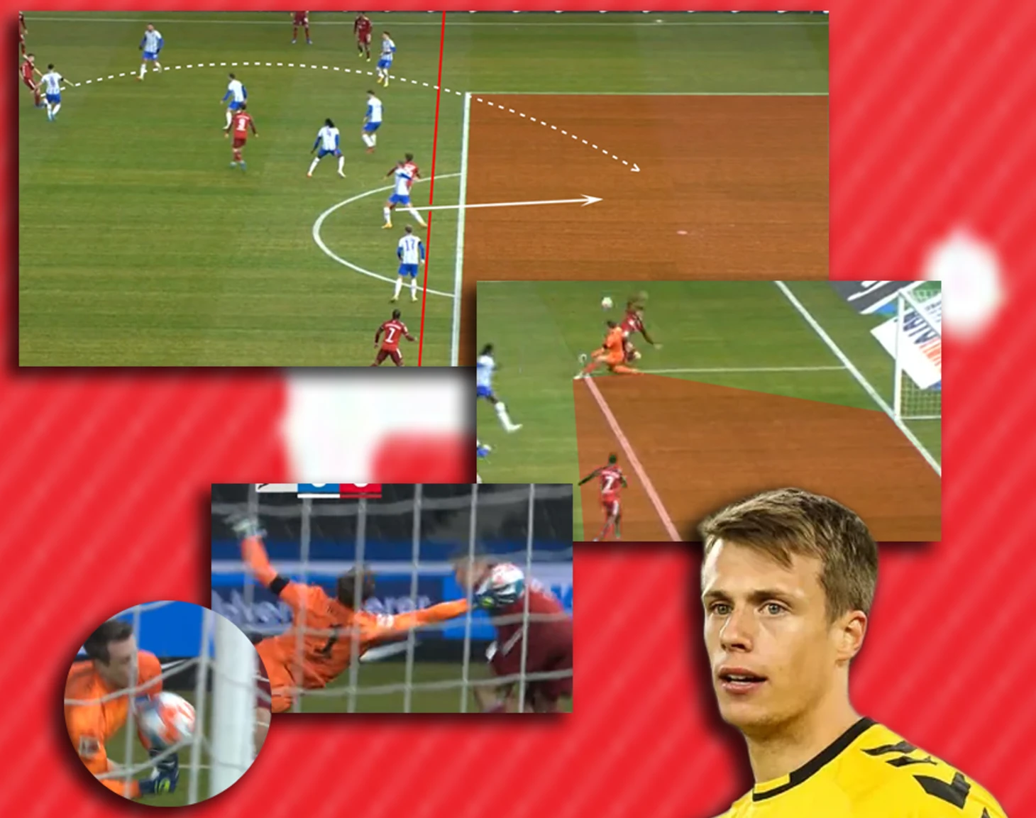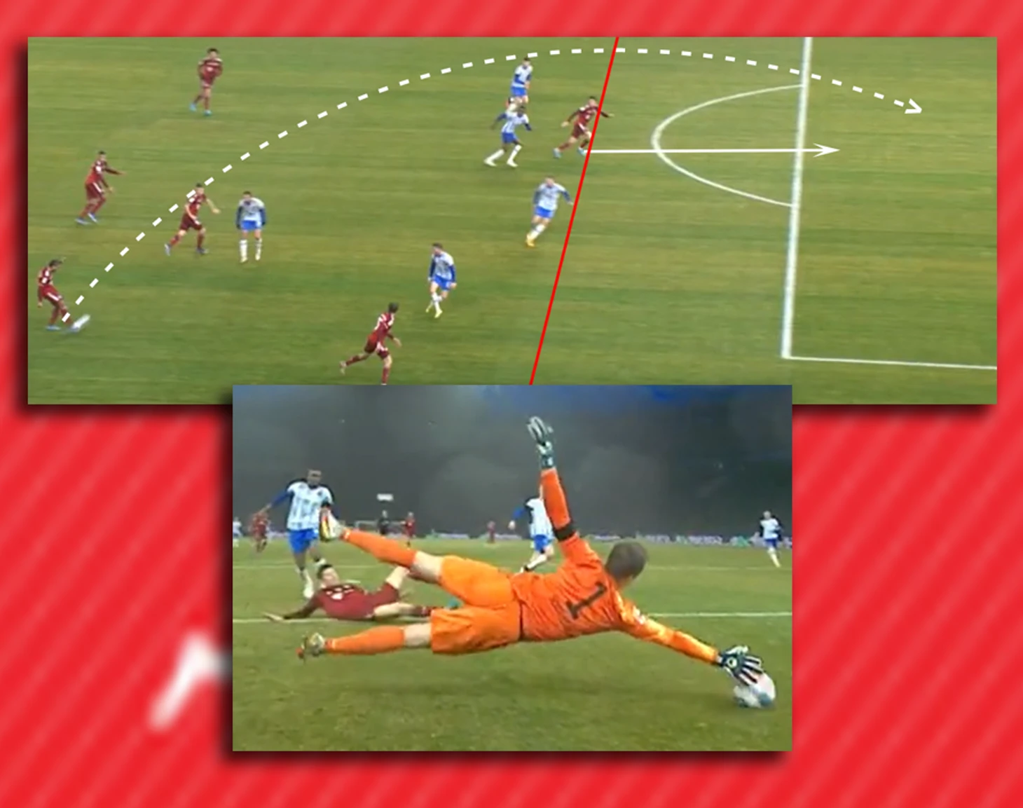 Практически в самом начале матча Шволов спасает «Герту» от неминуемого гола, совершая тройной сейв! Защитники не успевают сделать синхронный шаг вперед, чтобы Томас Мюллер попал в офсайд, поэтому в районе вратарской зоны возникает ситуация 2в1 против голкипера хозяев. Александр, выходя с ленточки, увеличивает площадь тела, как бы тенью закрывает ворота и перекрывает возможный адресат паса на Гнабри. Шволов блокирует первый удар Мюллера, затем в акробатическом прыжке дотягивается до отскочившего в ворота мяча, а после лицом препятствует добиванию!