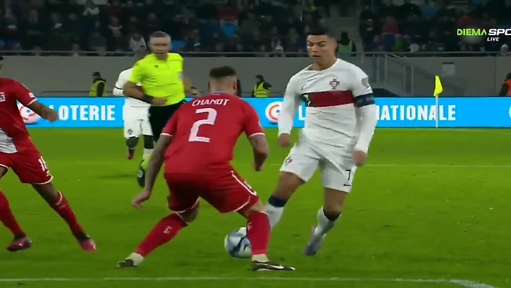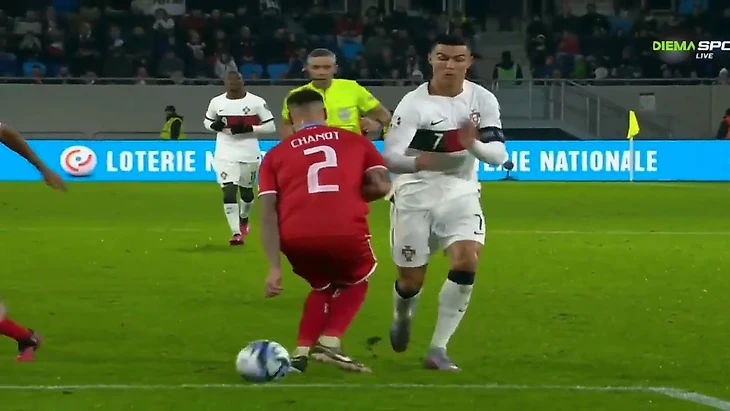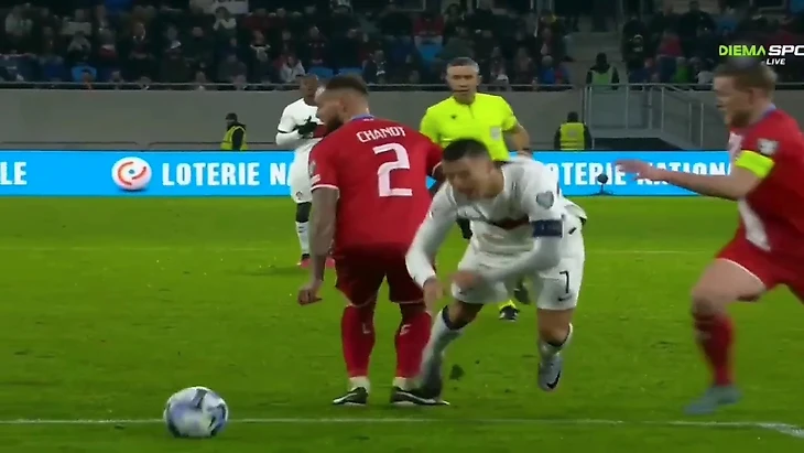 На 57-й минуте португалец упал на углу штрафной площади соперника, пробросив мяч между ног защитнику Максима Шано, и с этого ракурса не вызывает вопросов, что Криштиану специально нырнул.