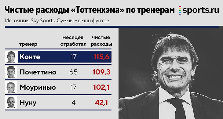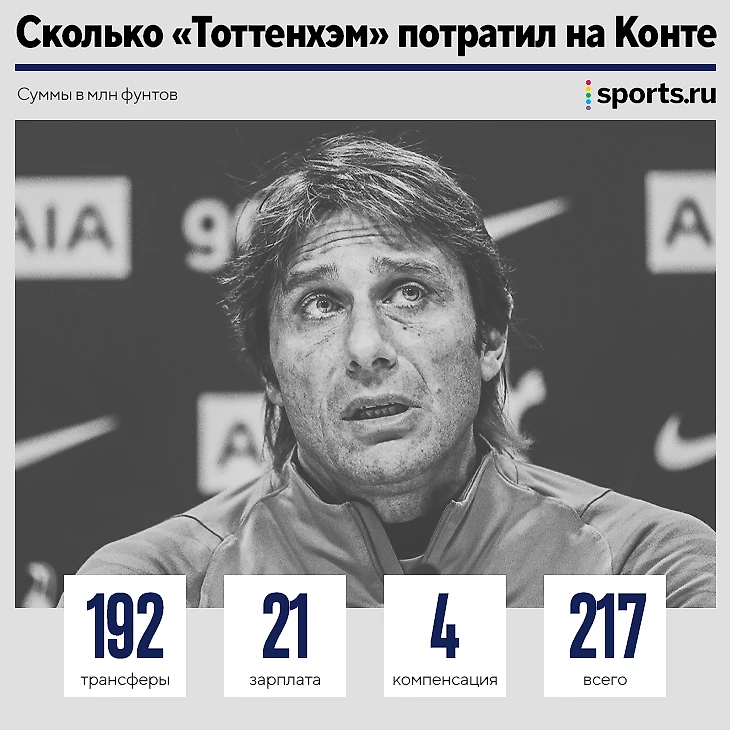 Конте – пятый тренер «Тоттенхэма» за 10 лет, получивший крупную неустойку. Правда, на фоне Жозе Моуринью и Нуну компенсация для Антонио выглядит скромно. Всего клуб потратил на неустойки уволенным тренерам 55 млн евро за 10 лет.
