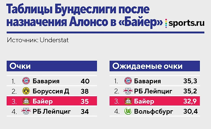 Алонсо точно любит владение и позиционную атаку, но при этом вообще не выглядит радикальным доминатором. «Байер» идет 5-м по владению в Бундеслиге, после тренерской перестановки показатель не вырос даже на процент – так и держится в районе 52%.