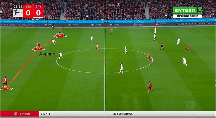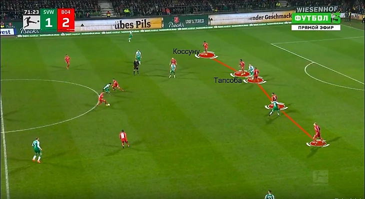 «Байер» начинал с понятных 3-4-3, на 61-й минуте перестроился на 4-4-2 ромб, на 77-й вернулся к тройке ЦЗ, заканчивал матч с крайними защитниками Хадсоном-Одои и Беллараби (номинально фланговые игроки атаки) и двумя ЦЗ. Вот так менялся только центр защиты: Коссуну-Тапсоба-Инкапье, затем Тапсоба-Инкапье со спусками Андриха, затем Тапсоба-Та-Инкапье, затем Тапсоба-Та.