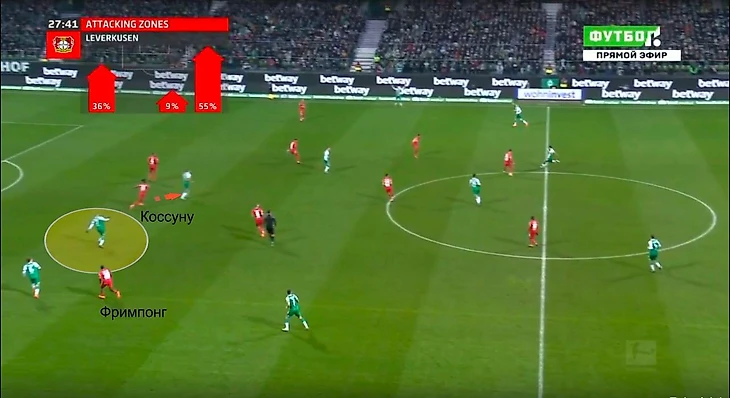 Против «Вердера» (3:2) «Байер» стабильно получал забросы в зону Коссуну, правого центрального защитника в тройке при 3-4-3. Коссуну очень плохо выбирал моменты для агрессивных выпадов – сразу получал за спину. В середине второго тайма Алонсо убрал Фримпонга, который уже набегался в атаке и не очень помогал со страховкой Коссуну, и выпустил Тапсоба. Он занял место Коссуну, а тот сместился на позицию латераля, которую занимал Фримпонг.