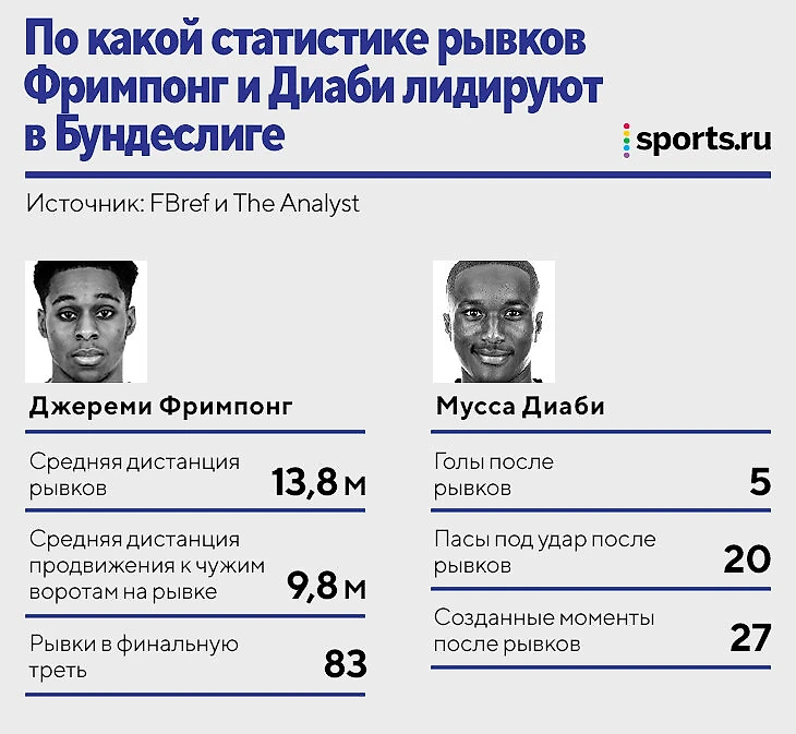 Вот статистика Фримпонга и Диаби по рывкам с мячом. Лишь та статистика, где Диаби и Фримпонг лидируют. Много где они еще занимают места в топ-3. Например, пасы под удар после рывков: в таблице указан Диаби, но Фримпонг идет сразу за ним! Самое удивительное, что не все эти показатели рекордные. Норма Диаби и Фримпонга по карьере.