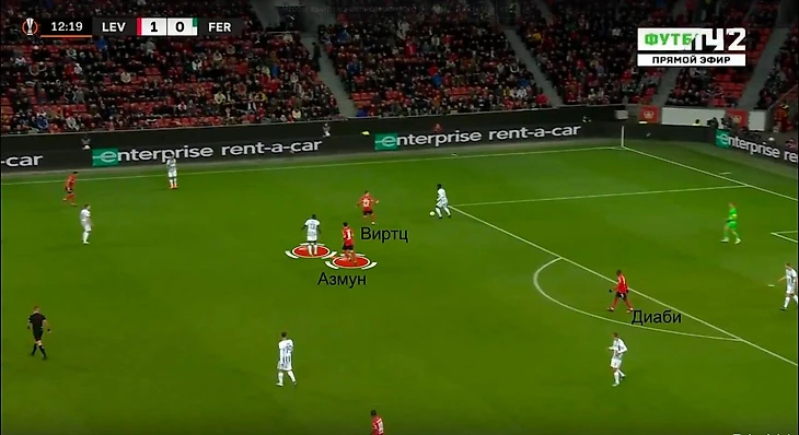 Алонсо явно хочет, чтобы нападающий приносил пользу и без мяча. У него не уникальный, но любопытный прессинг-план: если соперник играет с парой ЦЗ, на эту пару выдвигаются инсайды (например, Виртц и Диаби), а форвард играет по опорнику.