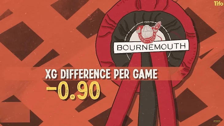 С другой стороны есть «Борнмут», который имеет показатель разницы ожидаемых моментов за игру около -0.9. Это означает ожидание того, что они пропустят больше, чем соперники: примерно на 1 гол. Это отражается на их положении в турнирной таблице, где клуб Южного побережья в настоящее время занимает одно из мест на выбывание.