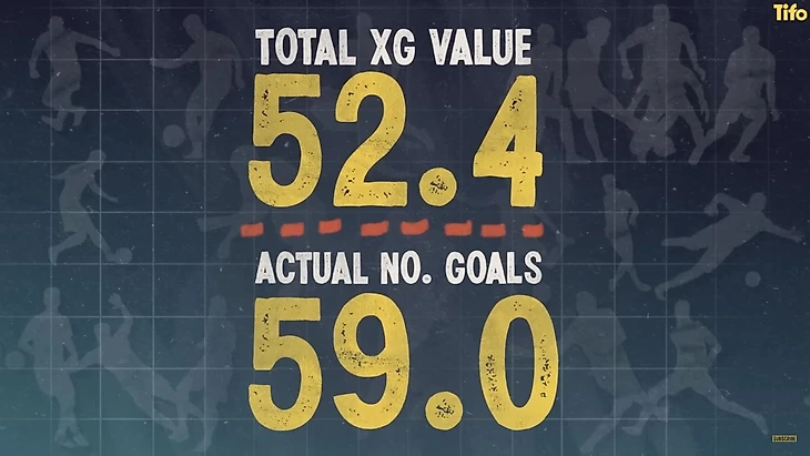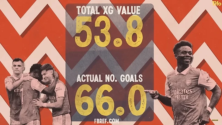Например, после победы над «Кристал Пэлас» (со счетом 4:1), «Арсенал» имеет в этом сезоне ожидаемое количество голов 53,8 - по сравнению с 66 фактически забитыми голами по данным статистического сайта-агрегатора «FB Ref». Это значит, что они перевыполнили показатель своих ожидаемых голов на 12,2 - другими словами, они забили на 12 голов больше, чем ожидалось.