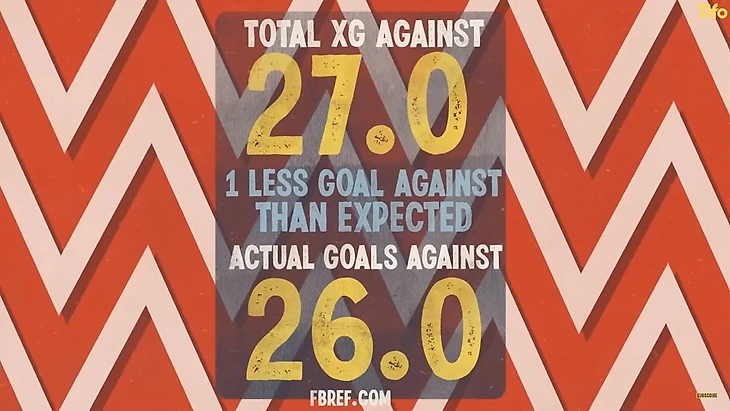 На другом конце спектра, за тот же период, «Арсенал» имеет 27,0 ожидаемых пропущенных голов по сравнению с 26 фактически пропущенными. Это отражает превышение показателей, но гораздо более меньшее по сравнению с забитыми мячами, так, лондонский клуб пропустил на один гол меньше, чем можно было ожидать.