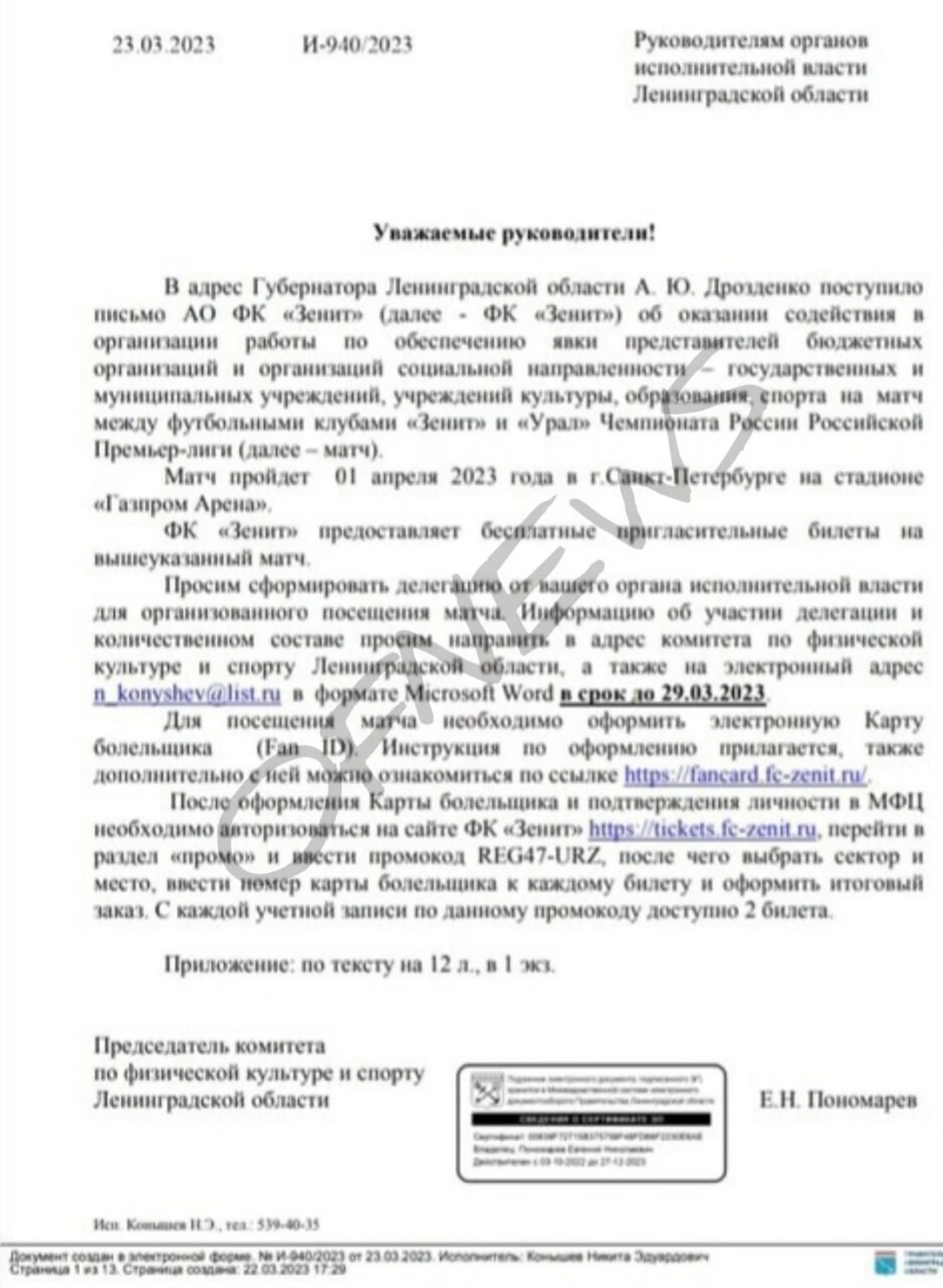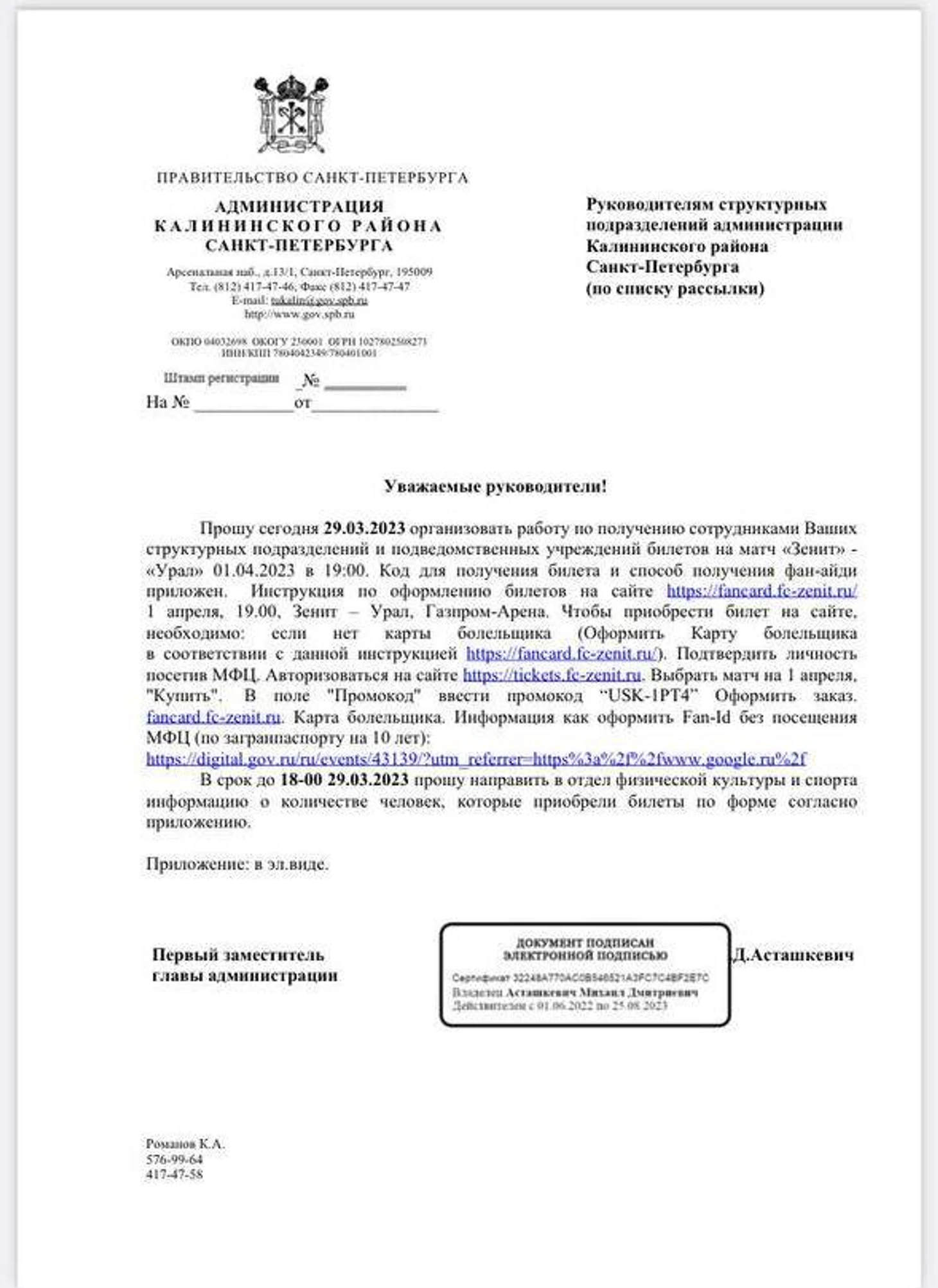 Перед матчем в том же канале засветились скрины документов, в которых бюджетным организациям поручают отправить сотрудников на футбол. Конечно, в письмах указаны промокоды на бесплатные билеты.