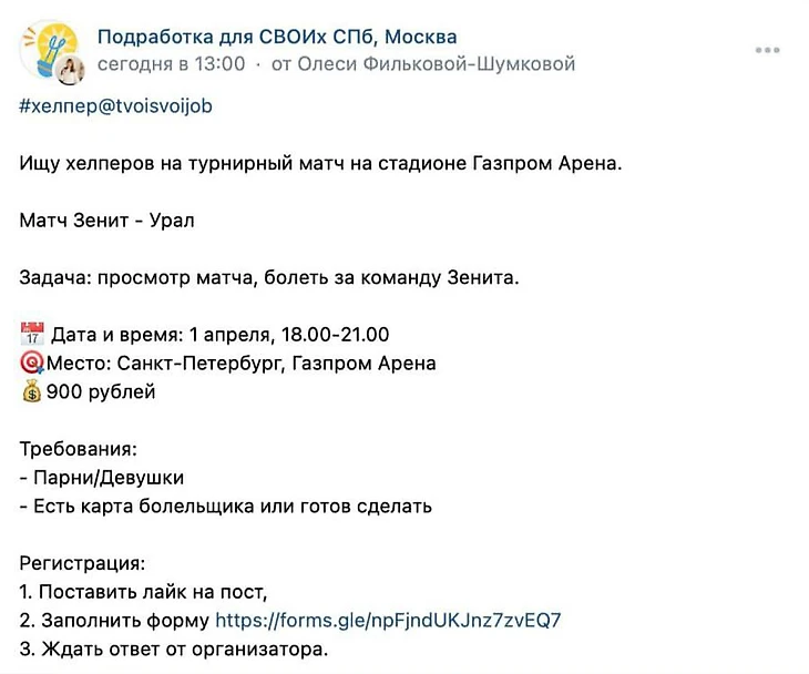 20 марта в паблике «Подработка для СВОИх» появилось удивительное объявление: приглашали на «Газпром Арену» и предлагали не просто бесплатные билеты, а выплату 900 рублей – при выполнении задания «просмотр матча, болеть за «Зенит».