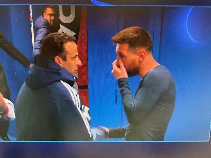 По пути Лео переговорил о чем-то весьма важном (даже прикрыл рот ладонью) с бывшим партнером по «Барсе» – Людовиком Жюли, который сейчас работает помощником главного тренера в «Лионе».
