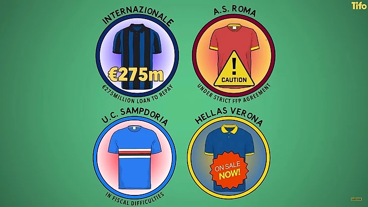 Миланский «Интер» должен погасить кредит в размере 275 миллионов евро уже к 2024 году, а процентная ставка составляет 12 процентов. Они, как и «Рома», попали под действие нового соглашения с УЕФА о финансовом фэйр-плей. Финансовые трудности испытывает «Сампдория», а «Верона» - один из нескольких клубов, выставленных на продажу, продолжает дрейфовать.