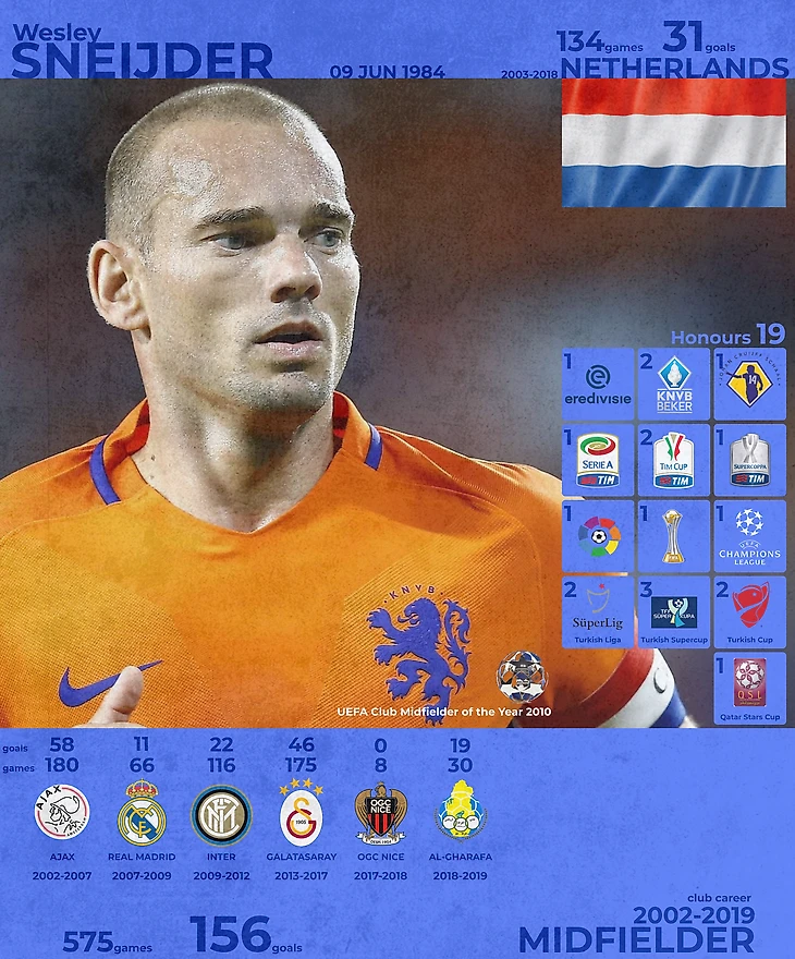 Собрал для вас всю информацию об Уесли Снейдере в одной информативной картинке. Приятного изучения. Мастер штрафных, супер талант, который полностью раскрыл свой потенциал в Интере. Снейдер был великолепен и, наверное, заслужил свой золотой мяч... Остается только посмотреть на статистику и немного поностальгировать от его славной карьеры.