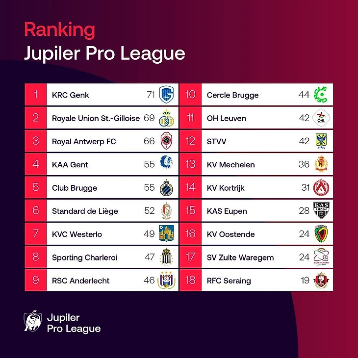 Клуб снова вернулся в четверку, откуда временно выпадал после победы «Брюгге», но теперь у него равное количество очков с конкурентом – по 55. «Гент» сейчас выше только за счет большего количества побед (16 – 15). Борьба за последнее место в чемпионском плей-офф обострилась.