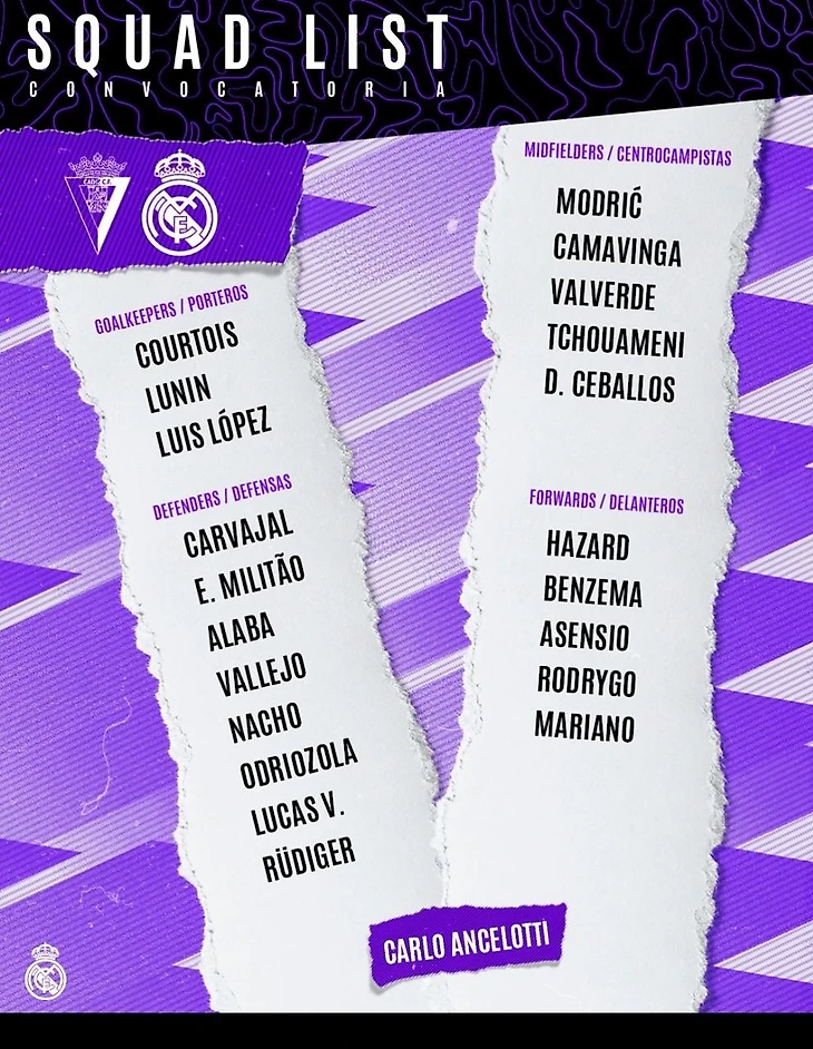 Вот заявка «Мадрида» на матч с «Кадисом»: