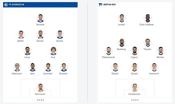 В состав «кобальтовых» вернулся защитник Мориц Йенц, без которого команда дважды проиграла. Поменял Томас Райс и центрального нападающего. На острие атаки вышел Симон Теродде вместо невезучего Михаэля Фрая, который после перехода из «Антверпена» до сих пор не мог отметиться дебютным голом. Сандро Шварц сделал ставку на пару форвардов Стеван Йоветич - Доди Лукебакио, рассчитывая, что полузащитники будут создавать для них шансы.