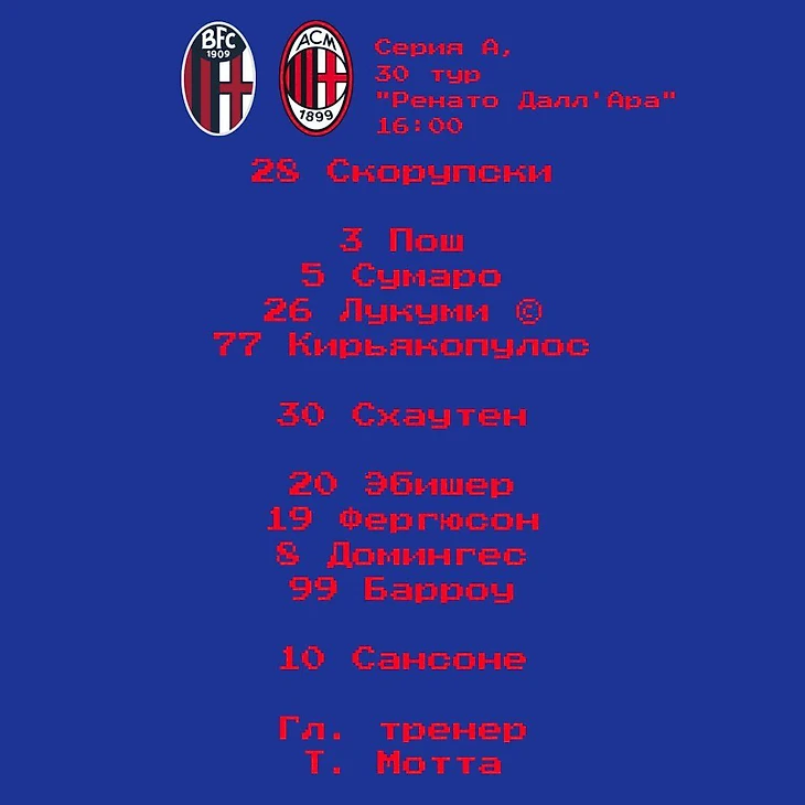 Состав «россонери» – «В любом случае я ожидаю лучшего «Милана» в сезоне, а потом в их составе сложно понять, кто основа, кто резерв. Мы смотрим только на себя, мы должны будем показать отличную игру».