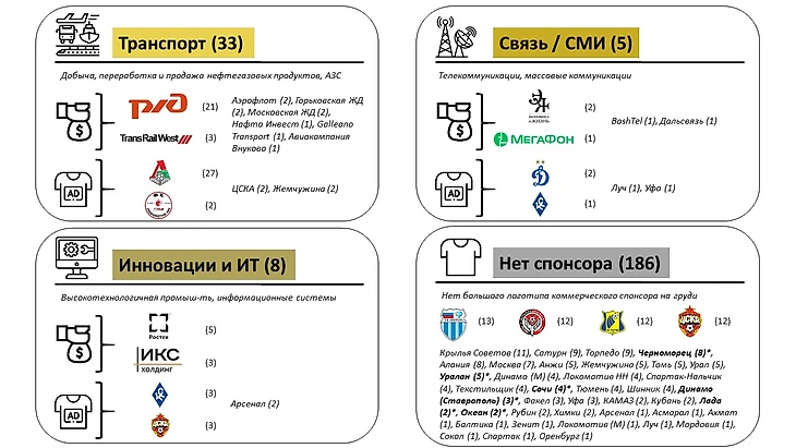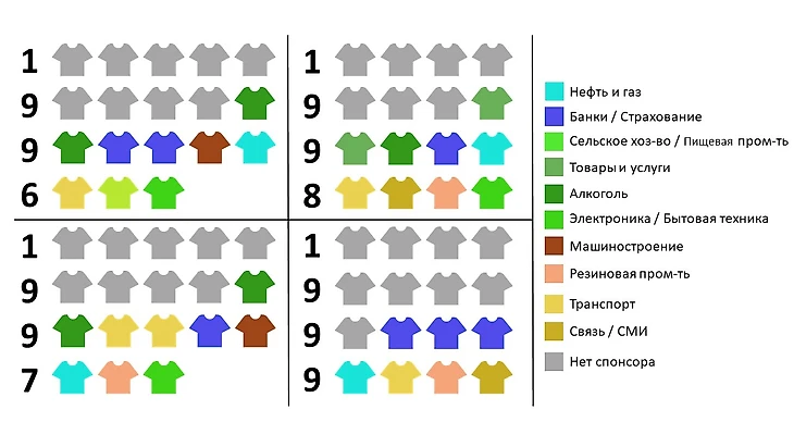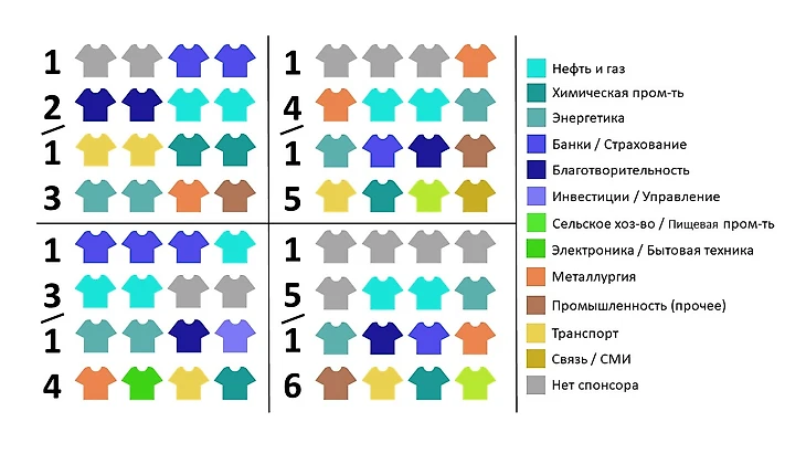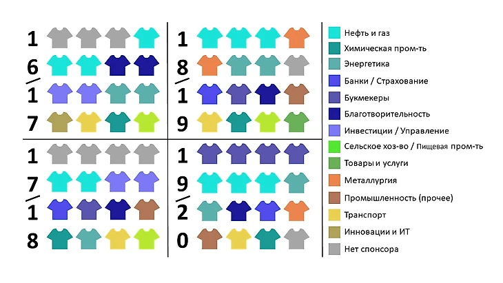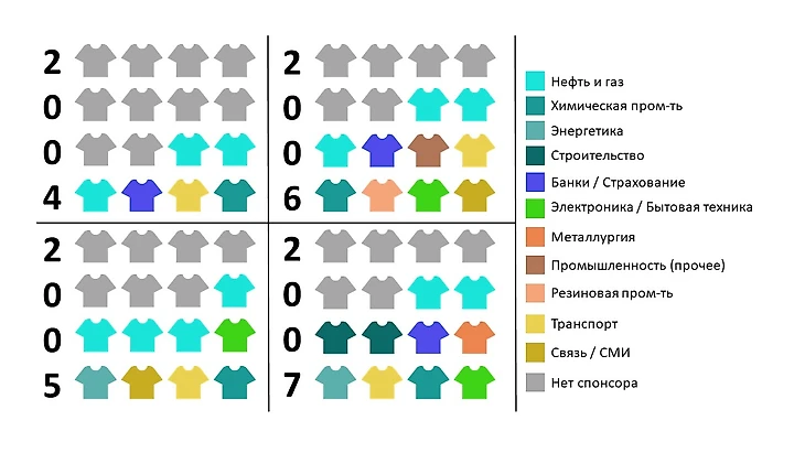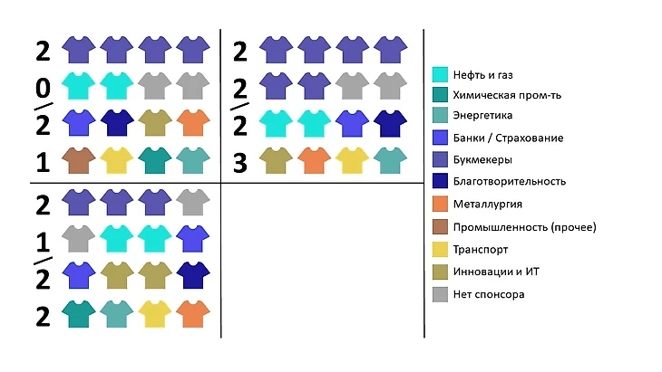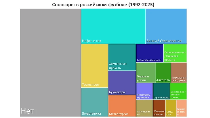 Спонсоры: в расчет брались только титульные спонсоры (размещавшие самый большой и заметный логотип на груди, лого на спине не считались). Для одной команды в рамках одного сезона выбирался только 1 спонсор (поэтому анализируется всего 506 фактов). Если спонсор менялся, то брался либо спонсор с большим количеством матчей, либо спонсор на начало сезона (поэтому для Динамо 2022/2023 в расчет брал ВТБ, а не BetBoom, с которым подписались зимой). Либо тот, информацию по которому удалось найти (привет, лихие и скудные на общедоступные качественные фото 90-ые!). Если логотипов было несколько, то брался либо самый большой, либо верхний (привет, Урал 2011-2018!). Если логотип был слишком маленький, то он не брался в расчет (привет, Химки 2020-2022!). Любой логотип (даже на пару матчей) имеет больший приоритет над пустой формой (тоже считалось в отдельную категорию). После сбора данных для каждого спонсора была указана сфера деятельности, после чего они были укрупнены до 20 категорий.