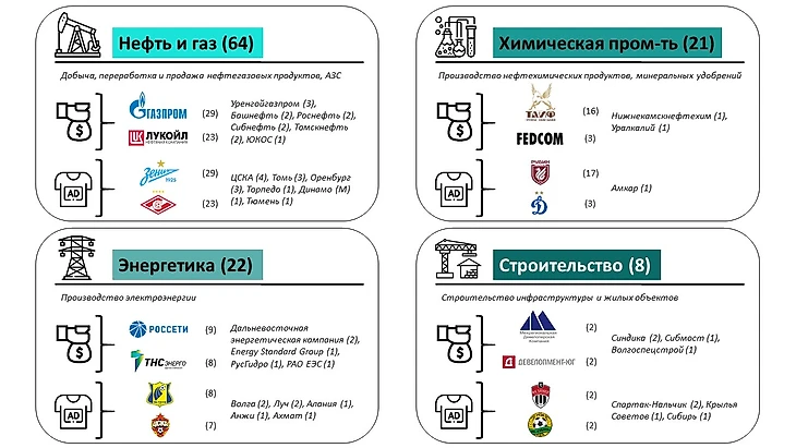 Самые частые сотрудничества - предсказуемо Газпром - Зенит (27), Лукойл - Спартак (23), РЖД - Локомотив (21). Также стоит отметить ТАИФ - Рубин (16), ВТБ - Динамо (13) и Общественный фонд имени Ахмата Кадырова - Ахмат (11).