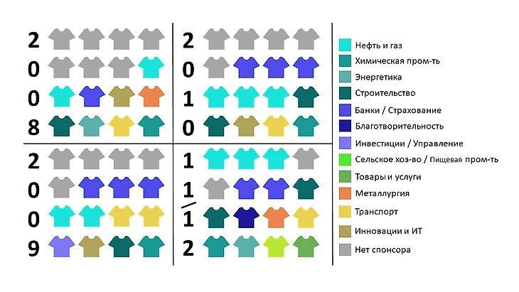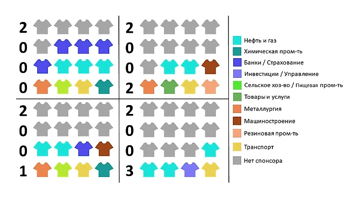 Что же у нас получается? До 2011 года наш футбол не был популярным местом для спонсоров (хотя с 2003 года доля пустых футболок начала снижаться), затем случился нефтяной бум (с перерывом на кризисные 2014-2017). А сезон 2013/2014 вообще стал самым разнообразным в плане титульных спонсоров. В наши дни первенство захватили букмекеры (хотя первые представители этой сферы появились только в 2017) и их доминация усиливается.