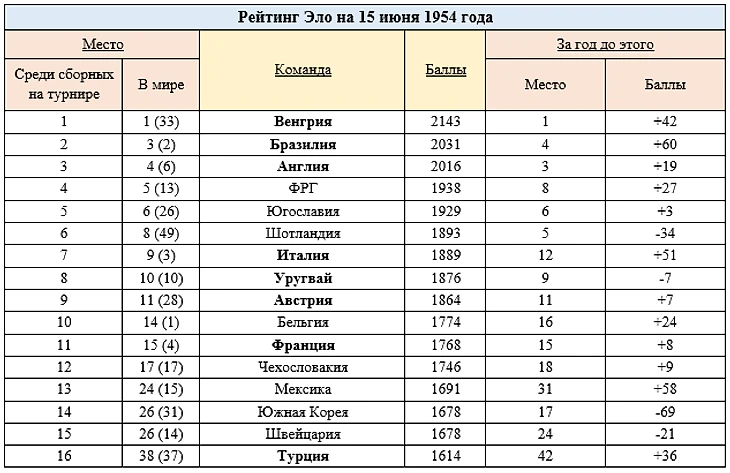Вот так выглядела таблица рейтинга Эло на 15 июня 1954-го (помимо вышеперечисленных команд, обратите внимание на высокие показатели Шотландии, за год до того и вовсе занимавшей пятую строчку, и относительно низкие действующего чемпиона мира Уругвая). Жирным шрифтом выделены сеянные команды, в скобках указано место сборной в мировом рейтинге Эло на июль 2021 года (Югославия = Сербия, Чехословакия = Чехия):