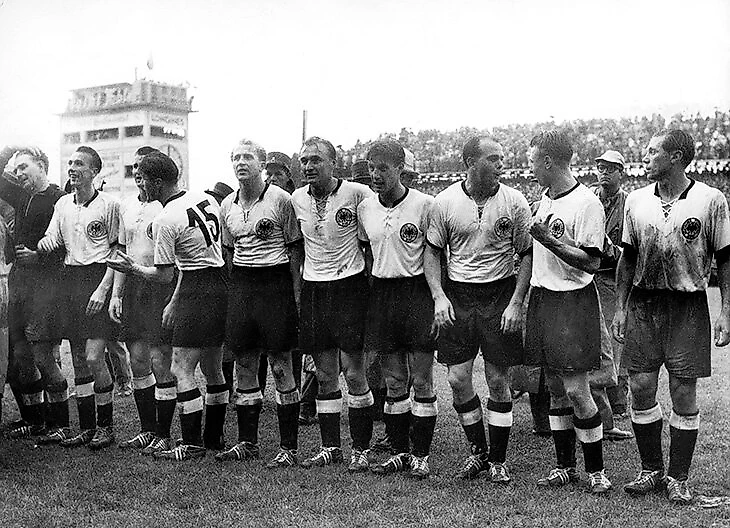 Капитан и суперзвезда: Самый опытный (39 матчей) и один из самых старших игроков немецкой сборной (33 года), Фридрих (Фриц) Вальтер, с которым вы уже немного знакомы, был, без сомнения, не только капитаном и признанным лидером своей команды, но еще и ее главной звездой. Вальтер был старшим из пяти детей, и его братья Людвиг и Оттмар также стали футболистами, игравшими в «Кайзерслаутерне». Людвиг звезд с неба не хватал, а после ранения, полученного на войне, так и не смог восстановиться, сыграв всего в нескольких матчах. Оттмар, на четыре года младше Фрица, также стал суперзвездой их общего клуба, но тягаться с братом в заслугах по игре в сборной не удавалось и ему. Уже в девять лет, выступая в футбольной школе «красных дьяволов», Вальтер привлек к себе внимание преданных фанатов клуба, ходивших на тренировки смотреть, как мальчик обращается с мячом, упражняется в обводках и ударах, накручивает защитников одного за другим. Уже тогда большое будущее ему прочили даже строгие тренеры, редко хвалившие своих воспитанников. Когда Фрицу исполнилось 14, о нем впервые написали в региональной газете, отметив талант юного центрфорварда молодежки «Кайзерслаутерна», а три года спустя он дебютировал в первой команде, сразу же забив два мяча. Перед войной будущий почетный капитан сборной ФРГ устроился работать в банк (футбол в стране не был профессиональным, что вынуждало игроков зарабатывать деньги на обычной, «гражданской» работе), благодаря выдающимся успехам в учебе, но уже в 1940-м его жизнь круто изменилась. Вальтера зачислили в Вермахт, после чего он продолжал играть в футбол, однако в абсолютно разных ипостасях: от «гостевого» игрока сборной оккупированного Парижа до актера, игравшего футболиста клуба «Норд» в фильме «Большая игра». Фриц утверждал, что за всю войну не сделал ни единого выстрела, хоть и постоянно позировал в военной форме в пропагандистских целях, что не помешало американским солдатам взять его в плен в Богемии в мае 1945-го, после чего Вальтера в числе остальные военнопленных передали войскам Красной армии. Футболист попал в лагерь Сигет Мармацией, на границе Румынии и Украины (здесь, к слову, родился лауреат Нобелевской премии писатель Эли Визель, узник Освенцима), где подхватил малярию, но все же вынужден был сыграть в футбол с венгерскими и словацкими охранниками. Один из них узнал знаменитого на всю Германию игрока, после чего, при содействии коменданта лагеря, Фриц вернулся в Германию и уже в октябре вновь вышел на поле в составе «Кайзерслаутерна». Впоследствии Вальтер назвал ту игру с охраной лагеря главным матчем в своей жизни. После возрождения сборной нападающий, игравший за национальную команду еще до войны, немедленно стал ее капитаном, но в октябре 1952-го чуть было не завершил международную карьеру. Тогда ФРГ играла в Париже со сборной Франции, и на глазах у десяти тысяч болельщиков, прибывших со всей Германии поддержать Die Mannschaft, потерпела поражение 1:3. На 31-летнего Фрица посыпались злобные комментарии со страниц спортивной прессы, после чего главный тренер сборной Зепп Хербергер позвонил жене своего капитана и приказал отключить телефон, задернуть шторы, неделю не выпускать футболиста из дома и не давать ему читать газет. Когда Вальтер попытался покинуть сборную и попросил Зеппа больше на него не рассчитывать, трене