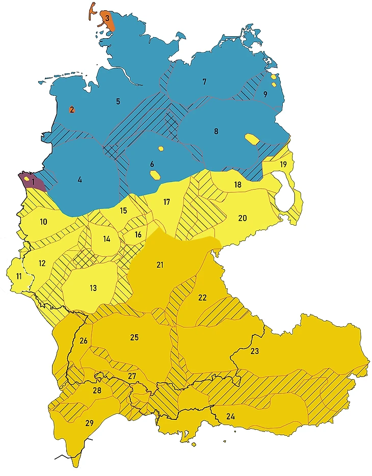 Возможно, современный немецкий вел бы родословную именно от любекского говора, но в 1534 году в саксонском Виттенберге Мартин Лютер опубликовал перевод Библии. Благодаря развитию книгопечатания идеи христианского богослова охватили Европу и породили Реформацию, а экземпляры книги быстро распространились по разрозненным графствам и княжествам. Так саксонское наречение постепенно вытесняло соседние и легло в основу будущей литературной нормы. Его причисляют к восточной ветви центральной группы верхненемецких языков (Hochdeutsch). Верхний и нижний в этом контексте отсылают не к сторонам света, а к рельефу Германии, где низины в большей степени распространены на северном побережье, а горы – на юге.
