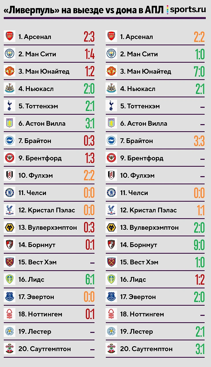 • Дома «Ливерпуль» сыграл меньше (14 игр вместо 16 на выезде) – но набрал в 2 раза больше очков (31 против 16 в гостях).