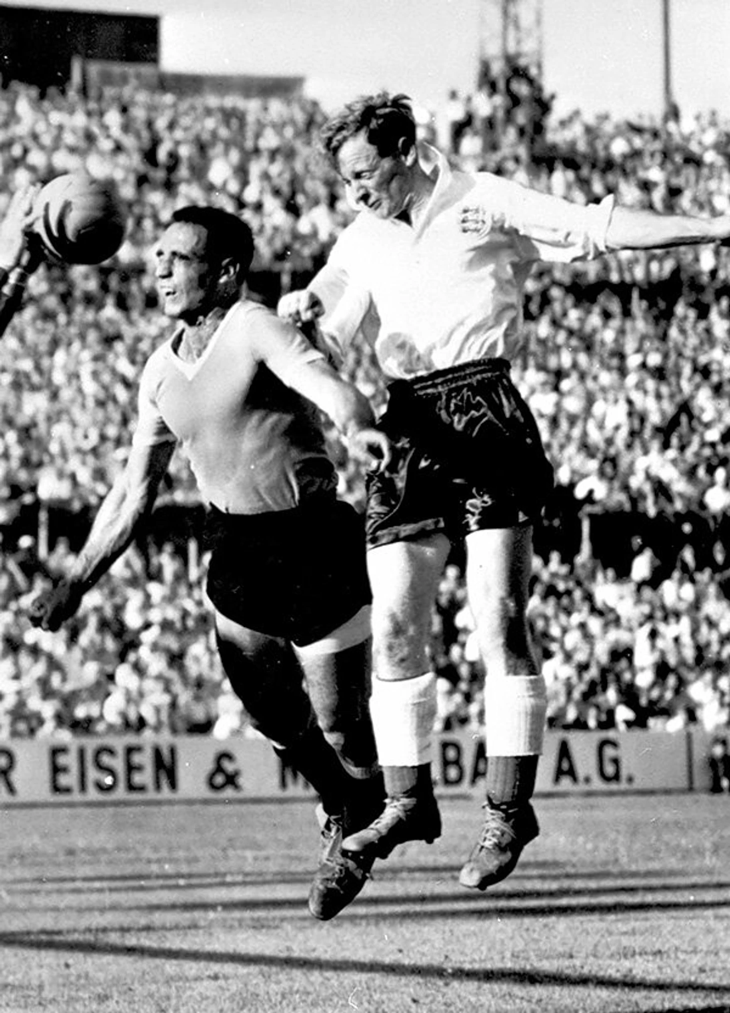 Суперзвезда: Футбольная история, точно также как история человечества, не слишком любит сослагательных наклонений. Рассуждения, вроде «эх, если бы не тот промах», «ах, если бы не тот фол», «ох, если бы не этот судья», принято называть «в пользу бедных» – ни к чему, кроме бесплодных мечтаний о том, «что было бы, если бы…» они обычно не приводят. Но я все же позволю себе помечать. В заявке сборной Англии на ЧМ-1954 хватало кандидатов на роль суперзвезды. Это и уже знакомые вам Стэнли Мэтьюз с Билли Райтом, и невероятный игрок атаки из «Престон Норт Энд» Том Финни, дважды «Футболист года» (76 матчей за сборную и 30 голов), запечатленный на одной из самых знаменитых фотографий в истории английского футбола, известной как «The Splash», которую превратили в статую в Престоне, и один из лучших британских форвардов в послевоенные годы «Венский лев» Нэт Лофтхаус (33 игры и 30 мячей за национальную команду). Однако сегодня я расскажу о другом футболисте, который перед началом мирового первенства к своим 22 годам успел сыграть за сборную в трех матчах, отличившись дважды, а также наколотил уже 48 (!) мячей в Лиге, став одним из самых дорогих игроков того времени, когда «Манчестер Юнайтед» Мэтта Басби купил его из «Барнсли» за 30 тысяч фунтов в апреле 1953-го (29.999, если быть точным: Басби не хотел, чтобы на 21-летнего форварда давил ярлык в кругленькую сумму, поэтому он дал один фунт из собственного кошелька даме, сервировавшей чайный столик во время переговоров), опередив «Вулверхэмптон». Томас Тейлор, которого все называли просто Томми, родился в небольшом городке Южного Йоркшира, и уже с четырнадцати лет начал работать на шахтах, играя в местной команде, собранной угольной компанией. Скауты «Барнсли» обратили внимание на талантливого футболиста два года спустя, и пригласили его в команду, за которую он дебютировал уже в 17, играя параллельно в резервном составе. В первом своем полноценном сезоне в Лиге нападающий забил 28 голов за свои старый и новый клубы, причем отметился дублем в первом же матче за «Манчестер Юнайтед». С тех пор эта планка не опускалась ниже 20, а в первом для английских команд розыгрыше Кубка чемпионов форвард сравнял количество сыгранных матчей и забитых голов: их было по восемь. Томми не был самым высоким игроком своего клуба, но благодаря мощному телосложению, отлично натренированным ногам и природной прыгучести почти всегда выигрывал борьбу за верховые мячи, забивая огромное количество мячей головой. С «малышами Басби» (такое прозвище получила молодая, дерзкая и суперталантливая молодежь манкунианцев, введенная в первый состав тренером команды) в «МЮ» Тейлор завоевал два чемпионских титула и два Суперкубка за два сезона, после чего тренер отклонил предложение «Интера» о трансфере форварда, сделавшего бы его самым дорогим игроком мира (итальянцы под предводительством великого Эленио Эрреры готовы были выложить около 2.5 миллионов долларов в пересчете на современные деньги – сумасшедшая сумма за футболиста в то время), а к февралю 1958-го, несмотря на несколько обидных поражений, «Юнайтед» по-прежнему оставался на верхних строчках таблицы, хотя догнать неудержимый «Вулверхэмптон» Каллиса было уже практически нереально. Зато в Кубке чемпионов в том сезоне «Манчестер» обеспечил себе место в полуфинале, справившись с неуступчивой «Црвеной 