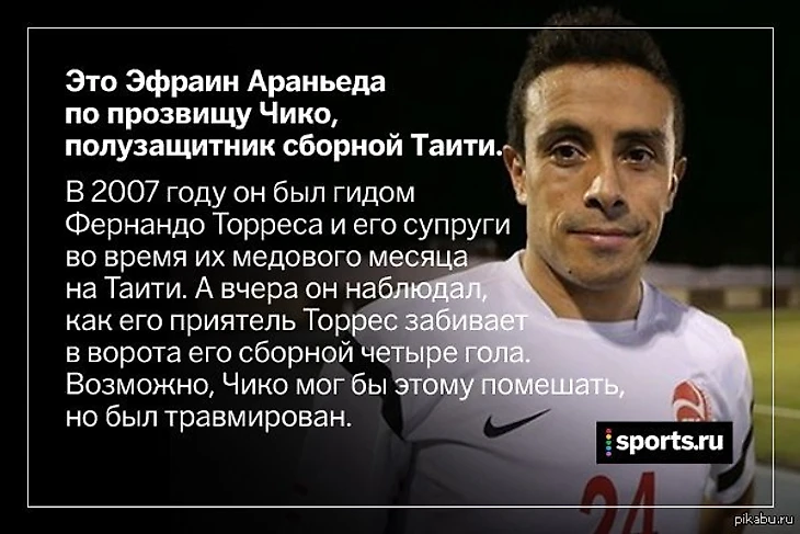 Также нельзя не сказать об игроке сборной Таити Эфраине Араньеде. Он, Вы только представьте, в 2007 году был гидом испанского форварда Фернандо Торреса и его жены Олальи во время медового месяца на Таити. Вот так бывает, ты устраиваешь человеку праздник, а он потом закидывает твоей сборной авоську мячей.