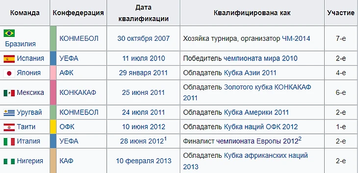 Помимо бразильцев на кубок сумели отобраться испанцы, итальянцы, уругвайцы, мексиканцы, нигерийцы, японцы, а также скромные таитяне (ставшие единственными дебютантами турнира).