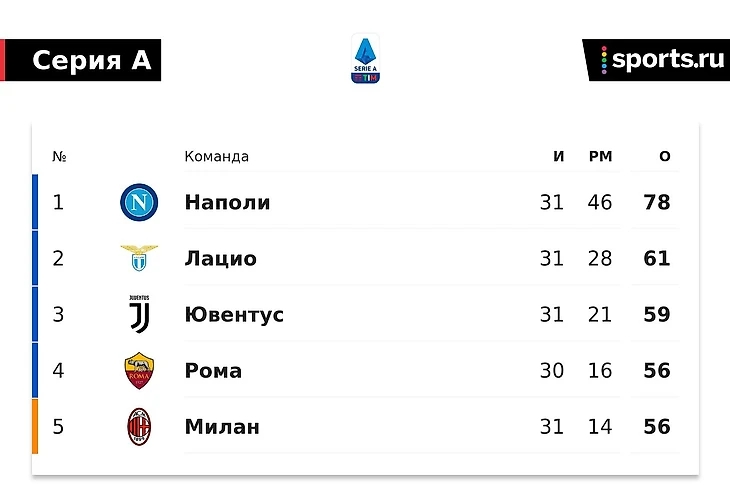 «Наполи» может стать чемпионом уже в следующем туре. Мечта Неаполя исполнится, если Хвича и компания обыграют «Салернитану» в субботу, а «Лацио» потеряет очки против «Интера». В этом сценарии «Наполи» становится чемпионом не на поле, потому что матч римлян – в воскресенье.