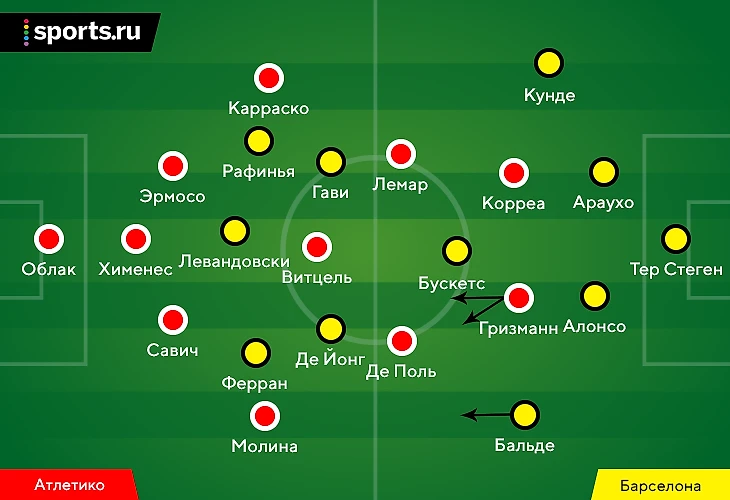 У «Барсы» в составе вернулись Френки де Йонг и Педри (стартовал на скамейке). «Атлетико» потерял Коке из-за травмы и Маркоса Льоренте из-за дисквалификации – шанс в опорной зоне получил Аксель Витцель.
